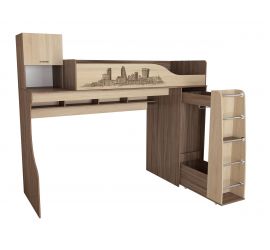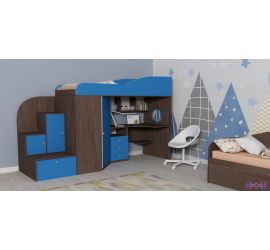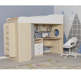 Второй вид кроватей-чердаков рассчитан на возраст детей от пяти лет. Спальное место в таком случае располагается на высоте 1,3-1,6 метра. На первом ярусе чаще всего есть шкаф и рабочая зона в формате письменного стола и книжных полок.